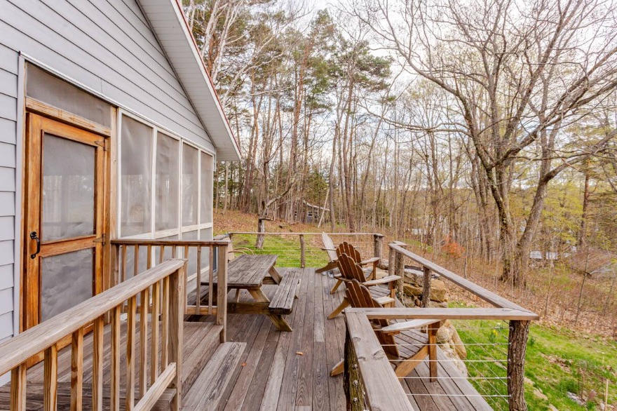 Roomy and comfortable, sleeps 6 in 3 bedrooms (queen, twins and bunks); mahogany floor; large screened dining porch; large deck w/ picnic table; brick fireplace plus gas heat; small lake view; skylights; shower, generator backup.