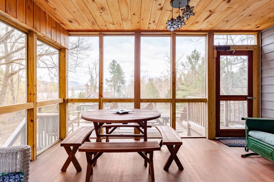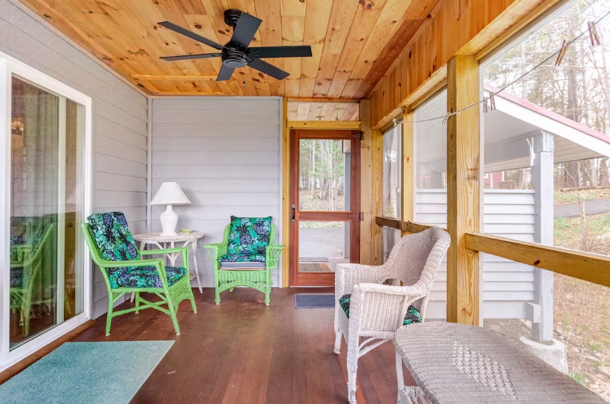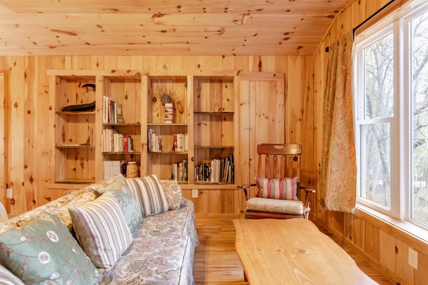 A tiny jewel. Double patio doors opening onto a large screened, dining porch, with attached deck and fireplace. Lake views. Completely finished in knotty pine with oak floors. Sleeps 3 in one bedroom (w/ a queen) and a daybed in the living room. Skylight, Vermont Castings fireplace-style woodstove, propane heat, generator backup; shower, picnic table.