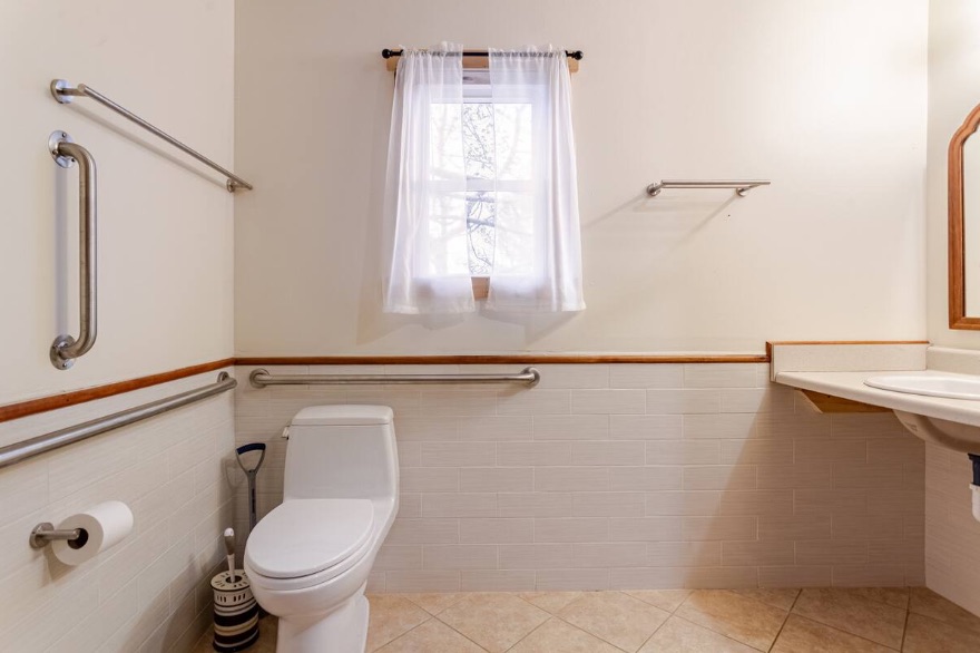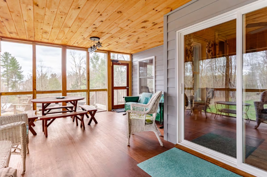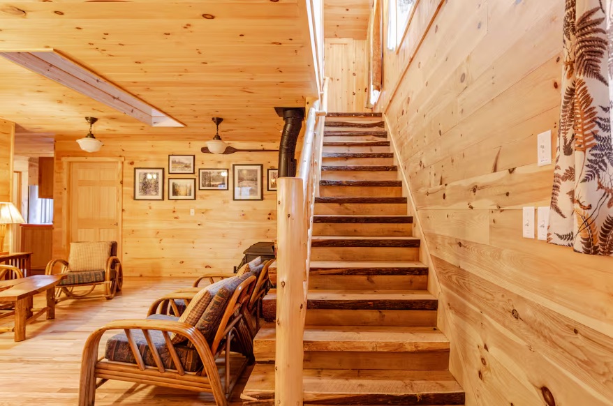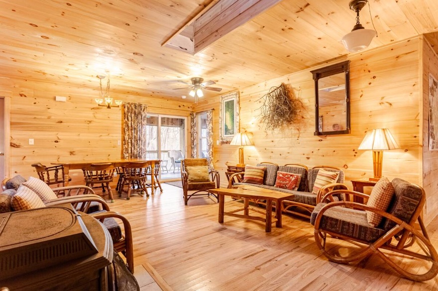 Big, New construction. Sleeps 8 in four bedrooms (king, twins, bunks; plus a queen & single in a separate suite upstairs). 2 & 1/2 baths, bathtub and showers, wrap-around screened dining porch, deck with fireplace and picnic table (deck not available during snow season), skylight, central heat, Vermont Castings fireplace-style woodstove, jumbo fridge, convection oven, generator backup, completely finshed in knotty pine with oak floors. Dramatic views. ADA compliant.