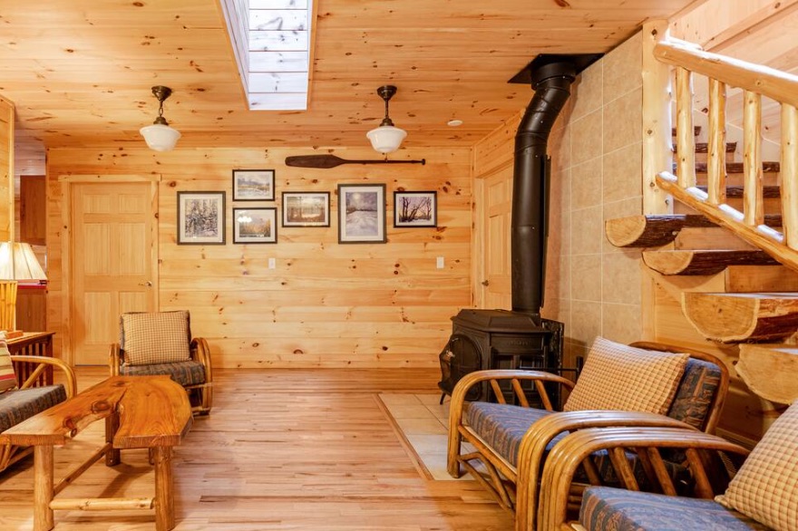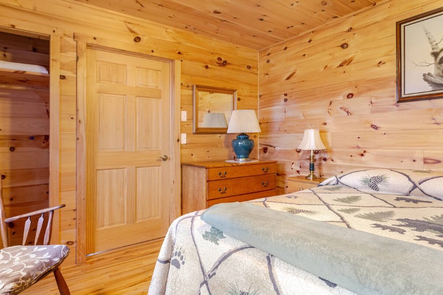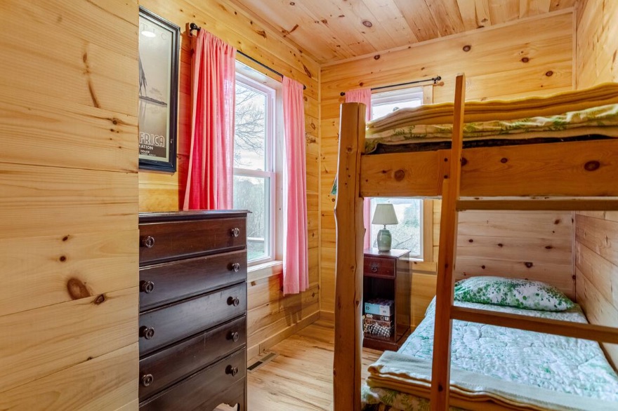 Located on a promontory, with expansive views of the lake; the cabin is completely finished in knotty pine with oak floors. It sleeps 6 in 3 bedrooms (queen, full, bunks); Vermont Castings fireplace-style woodstove; gas heat; shower; screened porch; deck; spacious yard w/ picnic table and a fireplace centered in front of a spectacular lake view. The Birch is 15 feet from the shore.