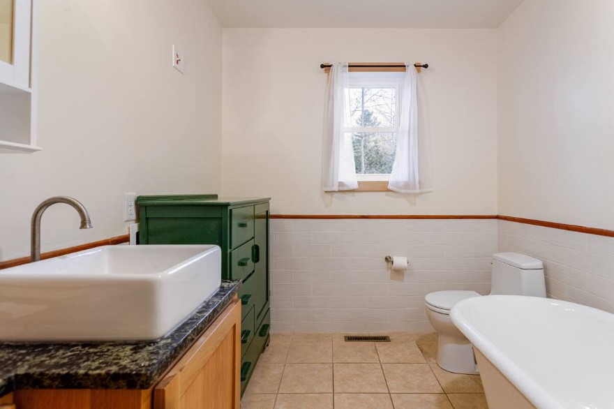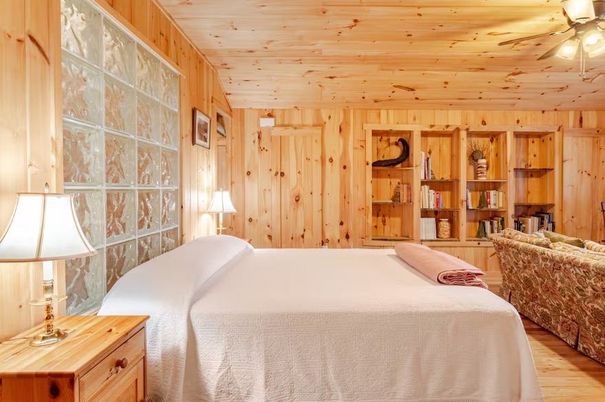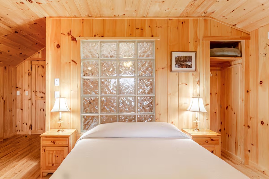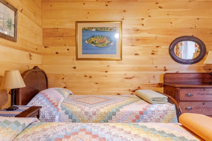 Roomy, with painted & knotty pine finishes, oak floors, sleeps 4 in 3 bedrooms (double, singles), plus a carpeted sleeping loft under skylights; screened porch; flat lawn area w/ picnic table; lake view; Vermont Castings fireplace-style woodstove, central heat; generator backup; tub/shower.