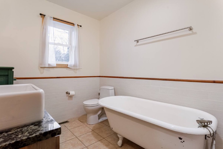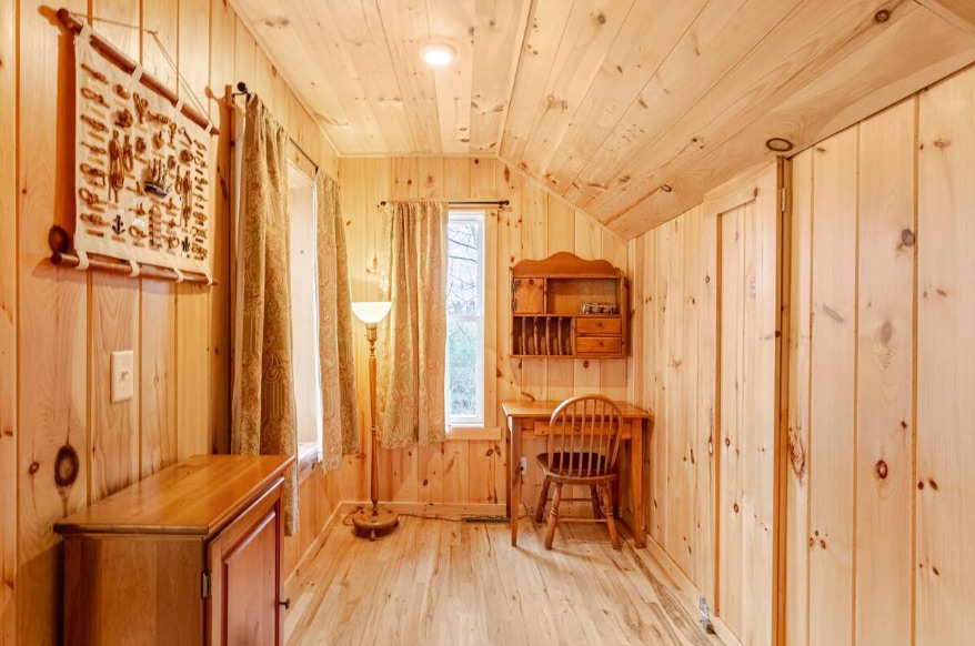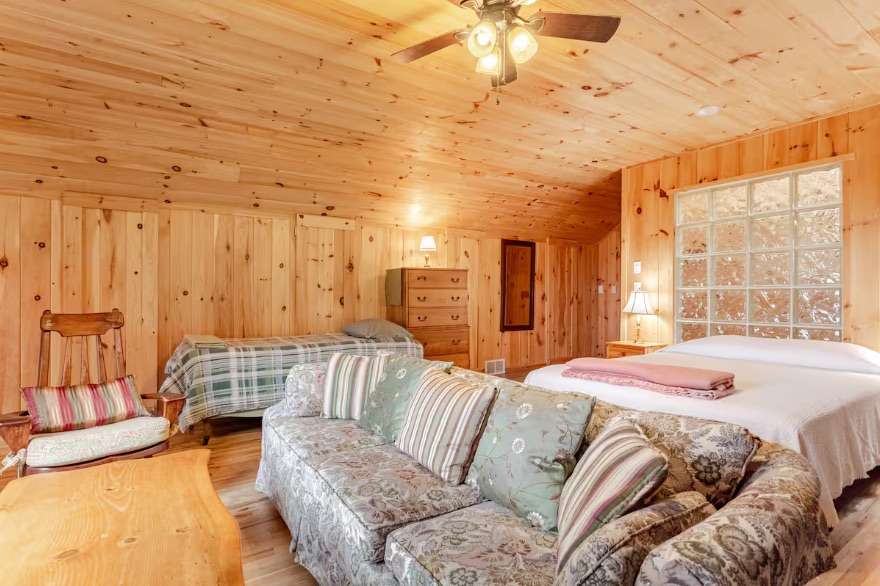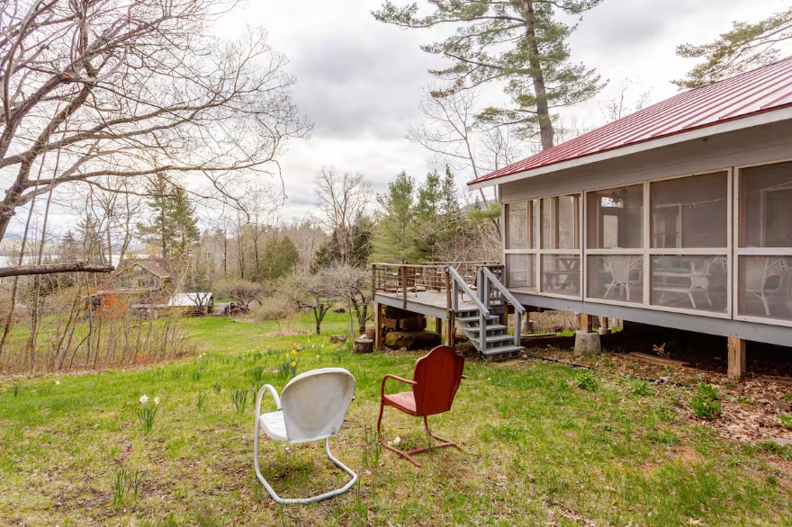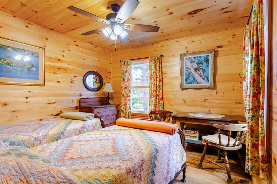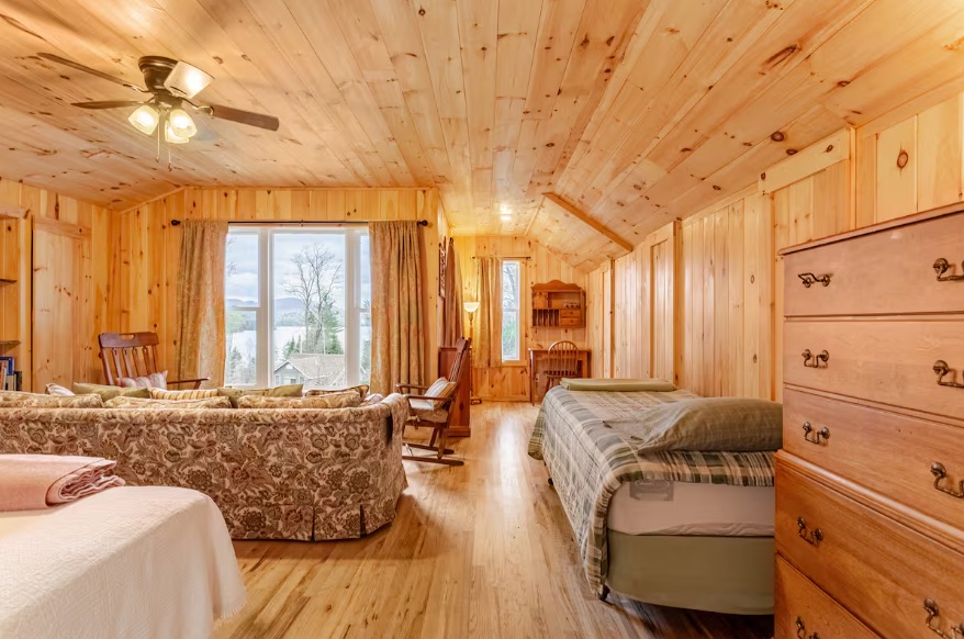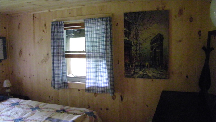 Roomy, with painted & knotty pine finishes, oak floors, sleeps 4 in 3 bedrooms (double, singles), plus a carpeted sleeping loft under skylights; screened porch; flat lawn area w/ picnic table; lake view; Vermont Castings fireplace-style woodstove, central heat; generator backup; tub/shower.