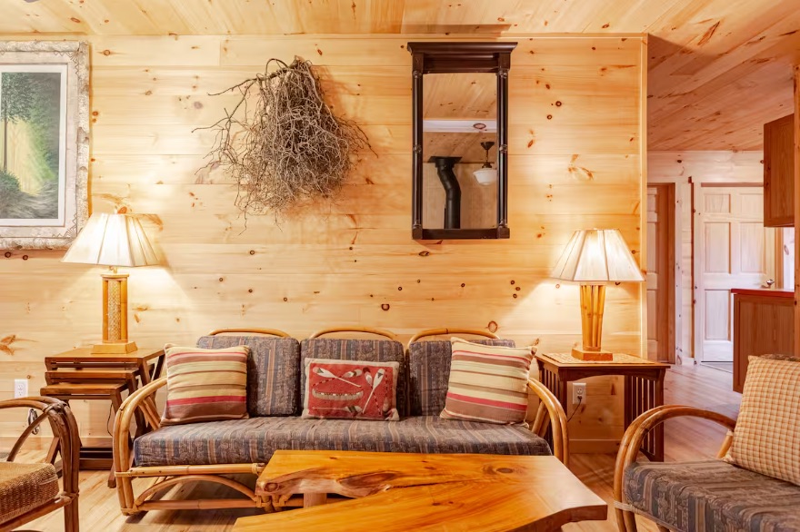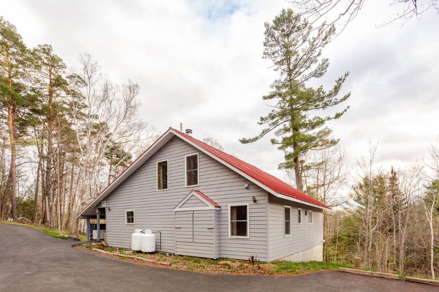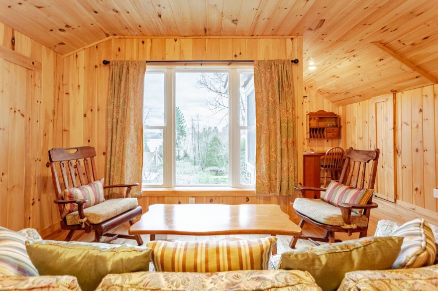 Big, New construction. Sleeps 8 in four bedrooms (king, twins, bunks; plus a queen & single in a separate suite upstairs). 2 & 1/2 baths, bathtub and showers, wrap-around screened dining porch, deck with fireplace and picnic table (deck not available during snow season), skylight, central heat, Vermont Castings fireplace-style woodstove, jumbo fridge, convection oven, generator backup, completely finshed in knotty pine with oak floors. Dramatic views. ADA compliant.