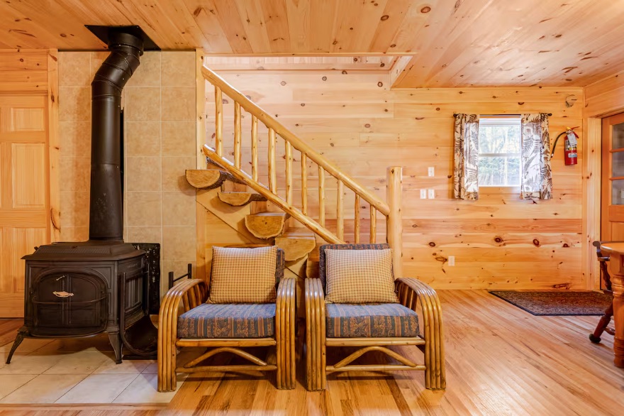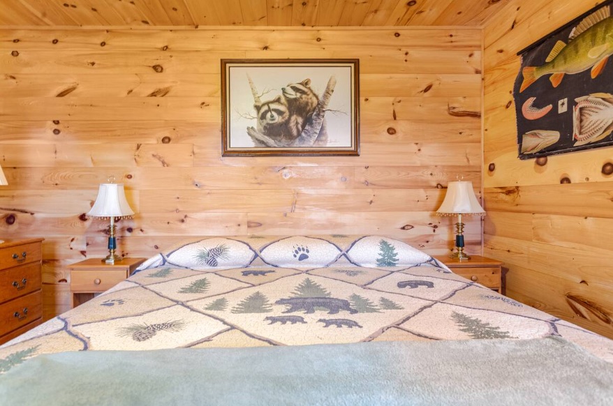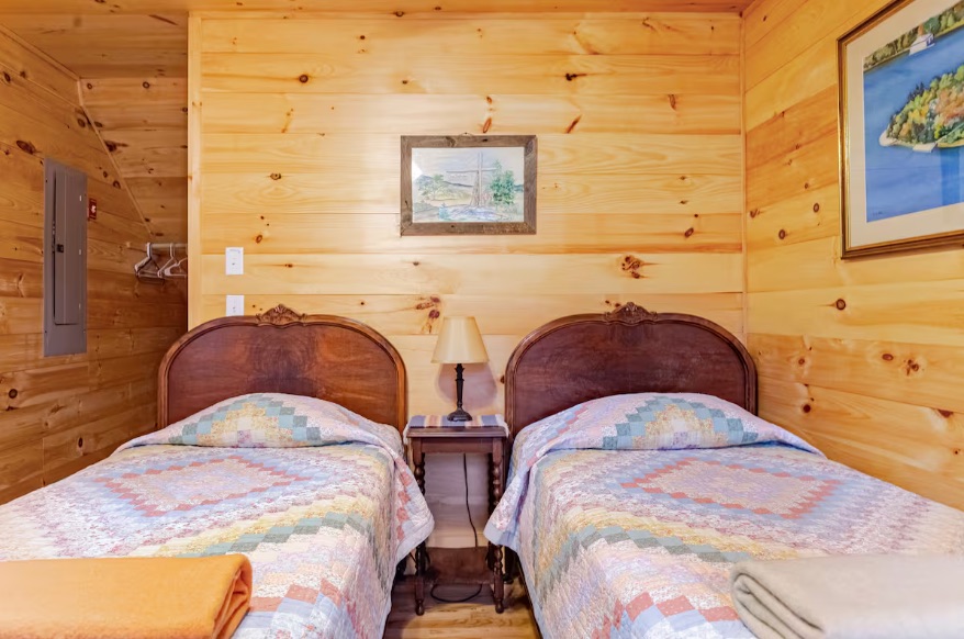 Located on a promontory, with expansive views of the lake; the cabin is completely finished in knotty pine with oak floors. It sleeps 6 in 3 bedrooms (queen, full, bunks); Vermont Castings fireplace-style woodstove; gas heat; shower; screened porch; deck; spacious yard w/ picnic table and a fireplace centered in front of a spectacular lake view. The Birch is 15 feet from the shore.