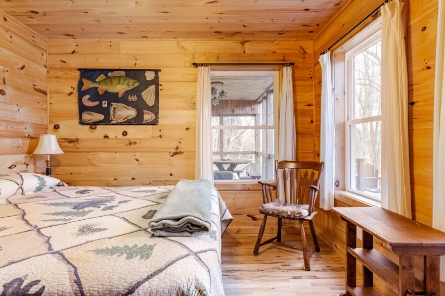 A tiny jewel. Double patio doors opening onto a large screened, dining porch, with attached deck and fireplace. Lake views. Completely finished in knotty pine with oak floors. Sleeps 3 in one bedroom (w/ a queen) and a daybed in the living room. Skylight, Vermont Castings fireplace-style woodstove, propane heat, generator backup; shower, picnic table.