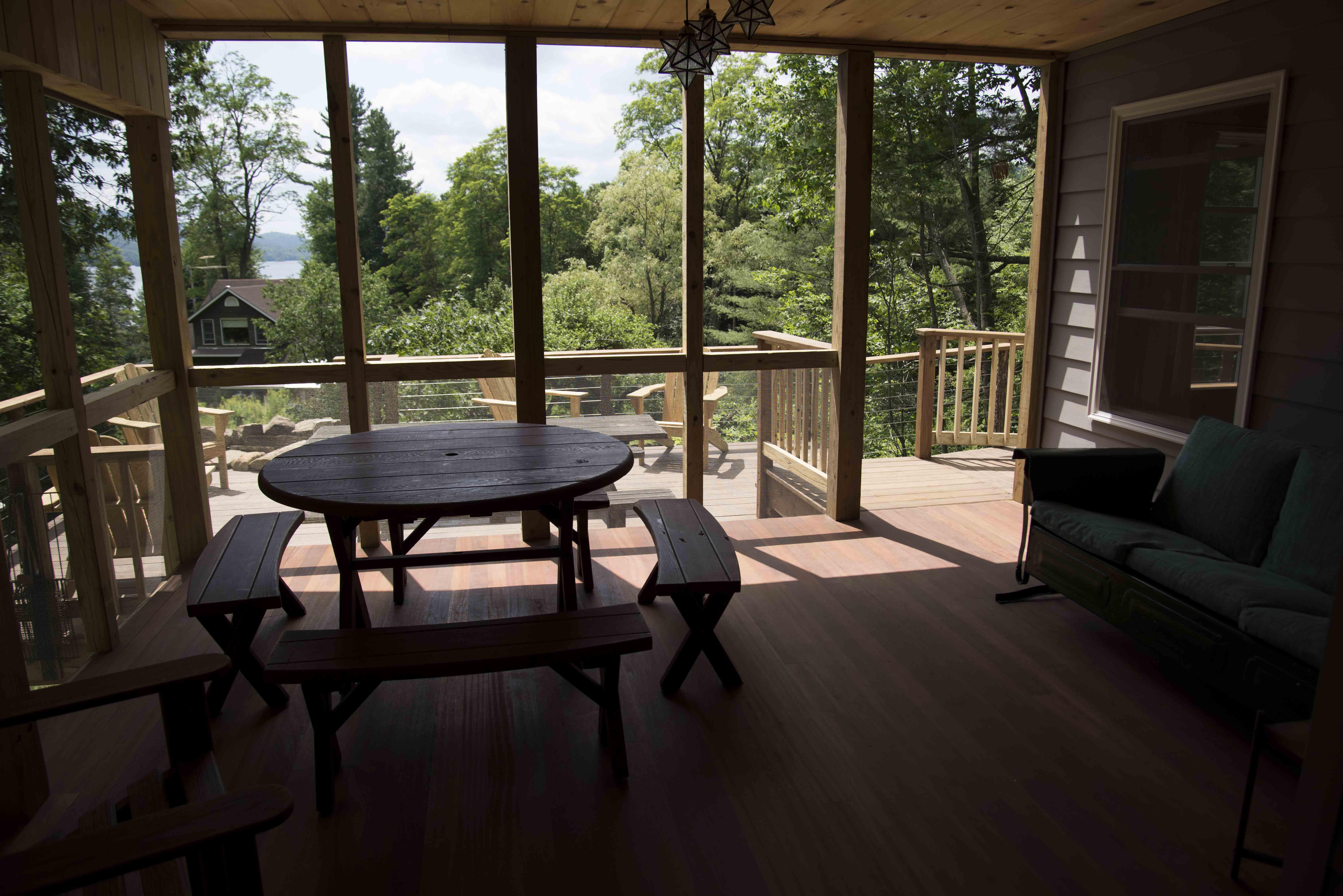 Big, New construction. Sleeps 8 in four bedrooms (king, twins, bunks; plus a queen & single in a separate suite upstairs). 2 & 1/2 baths, bathtub and showers, wrap-around screened dining porch, deck with fireplace and picnic table (deck not available during snow season), skylight, central heat, Vermont Castings fireplace-style woodstove, jumbo fridge, convection oven, generator backup, completely finshed in knotty pine with oak floors, generator backup. Dramatic views. ADA compliant.